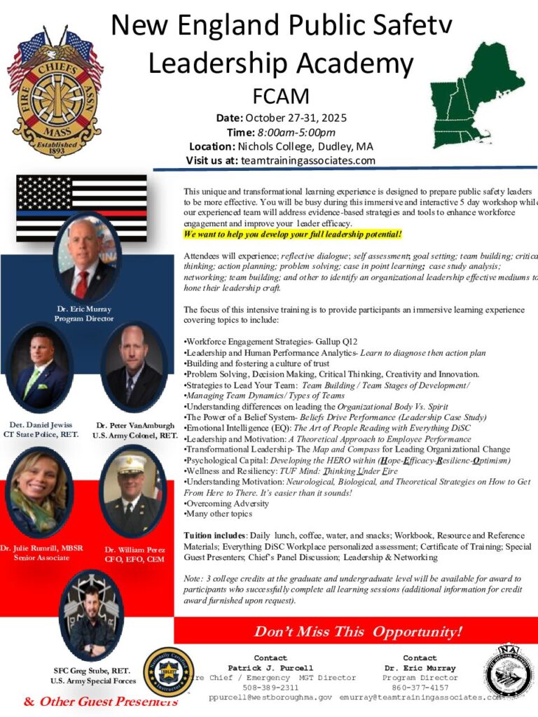 Welcome to the New England Public Safety Leadership Academy. Team Training Associates has partnered with the Fire Chief’s Association of Massachusetts (FCAM) to offer this unique and dynamic