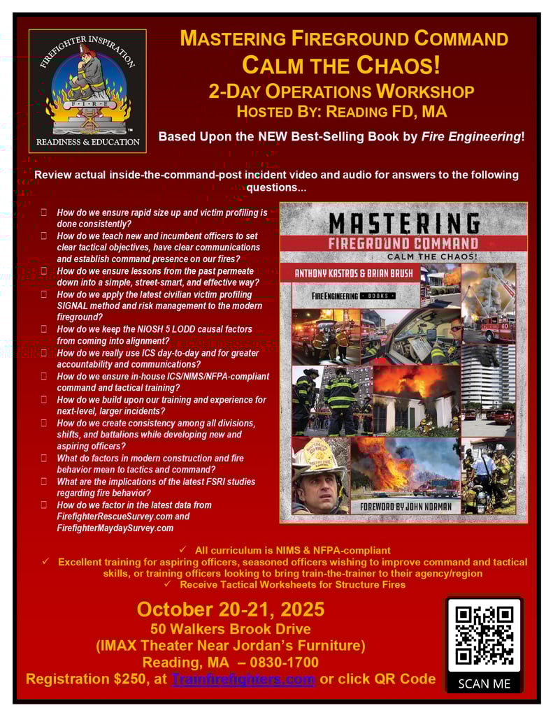 Reading Fire will be hosting an ICS training opportunity that has never been held in New England. It is a two-day course being delivered by Chief Kastros and is based on his book “Mastering Fireground Command – Calm the Chaos!”